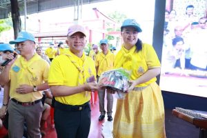 ผู้ใหญ่ใจดีสนับสนุนหมวกนิรภัยและขนมของรางวัลอื่นร่วมกันระหว่างทหารตำรวจนำมาจัดกิจกรรมจิตอาสาพระราชทาน