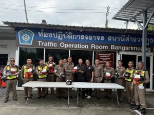 โดยมี พ.ต.อ.สมชาย แจ้งธรรมมา ผกก.สภ.บางศรีเมือง, พ.ต.ต.เสวต จันทมาส สวป.ฯ/หน.จร.สภ.บางศรีเมือง, จนท.จราจร และอาสาจราจร สภ.บางศรีเมือง เป็นผู้รับมอบ