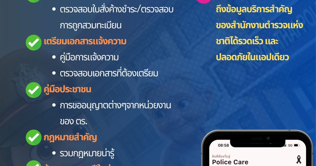āđāļāļāļāļĨāļīāđāļāļāļąāļ Police Care āļāļģāļŦāļāđāļēāļāļĩāđāđāļāđāļ âāļŦāļāđāļēāļŦāļĨāļąāļāļāļĢāļīāļāļēāļĢāļāļĢāļ°āļāļēāļāļâ āļĢāļ§āļĄāļāļąāļāļāđāļāļąāļāļāļĩāđāļāļĢāļ°āļāļēāļāļāđāļāđāļāļēāļāļāđāļāļĒ āļāļēāļāļī āļāļēāļĢāļāđāļāļŦāļēāļāļĢāļīāļāļēāļĢāđāļĨāļ°āļāđāļēāļ§āļŠāļēāļĢ āļāļēāļĢāļāļīāļāļāļēāļĄāļāđāļēāļ§āđāļĨāļ°āļāļĢāļ°āļāļēāļĻāļŠāļģāļāļąāļāļāļēāļāļŠāļģāļāļąāļāļāļēāļāļāļģāļĢāļ§āļāđāļŦāđāļāļāļēāļāļī āļāļēāļĢāđāļāļĢāļĩāļĒāļĄāļāļąāļ§āđāļāđāļēāđāļāđāļāļāļ§āļēāļĄ āļāļēāļĢāđāļŦāđāļāļ§āļēāļĄāļĢāļđāđāļāđāļēāļāļāļāļŦāļĄāļēāļĒāļāļĩāđāļāļĢāļ°āļāļēāļāļāļāļ§āļĢāļĢāļđāđ āļĢāļ§āļĄāļāļķāļāļāđāļāļĄāļđāļĨāļŠāļāļēāļāļĩāļāļģāļĢāļ§āļāđāļĨāļ°āļāļēāļĢāļāļīāļāļāđāļāļŠāļēāļĒāļāđāļ§āļāļāđāļēāļāđ āļāļąāđāļ§āļāļĢāļ°āđāļāļĻ